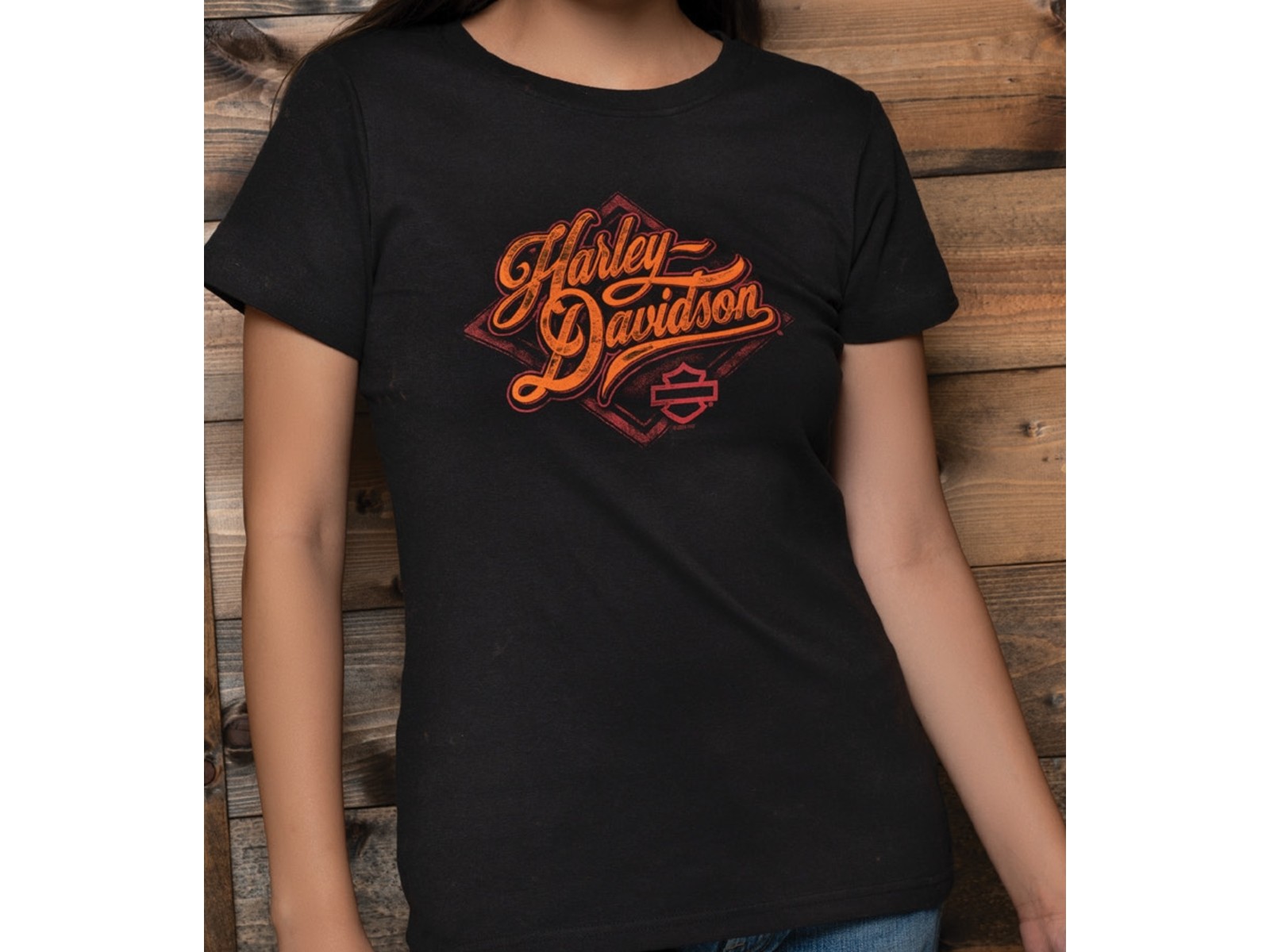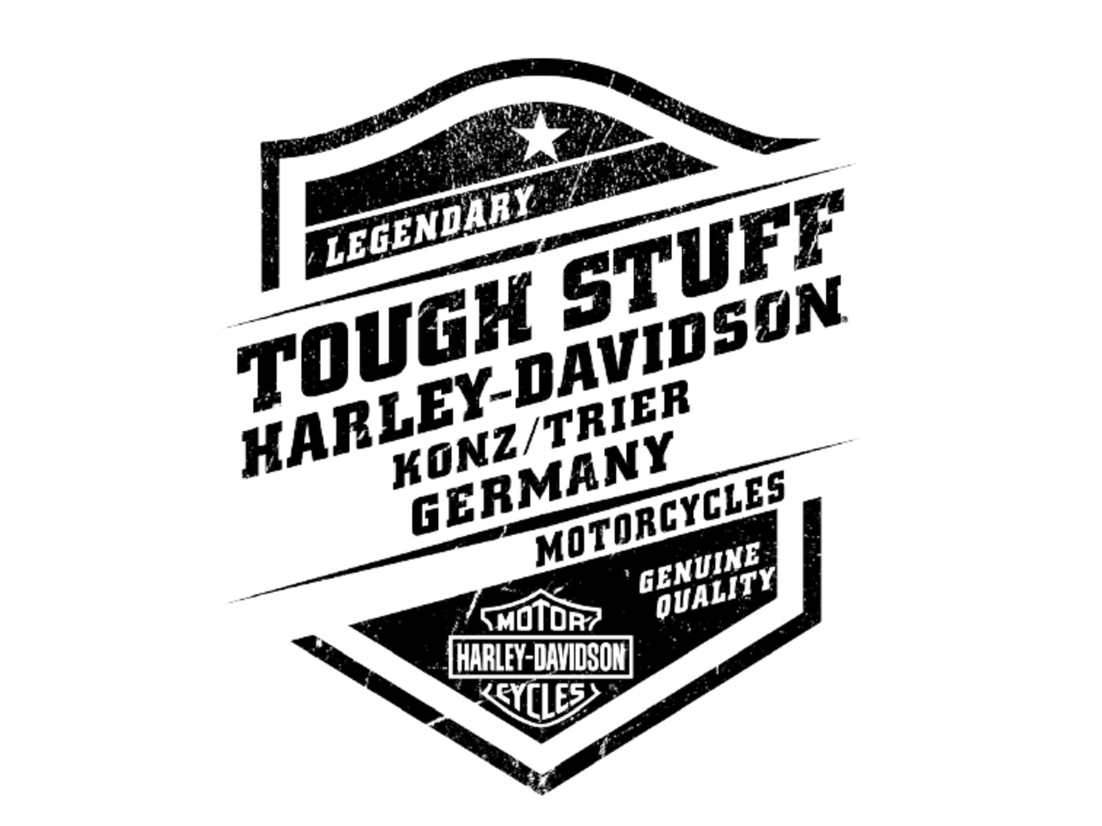 schwarzes T-Shirt mit orangem Harley-Davidson® Logo vorne und großem Tough Stuff Druck auf dem Rücken