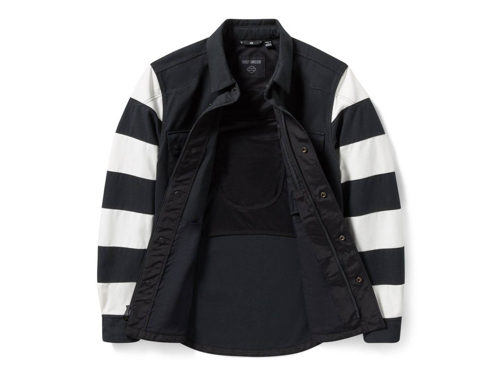 Das Retro-Motorrad-Design trifft bei unserer H-D® Breakout Operative 2.0 Riding-Shirt Jacket auf funktionalen Schutz beim Fahren. Die schwere Twill-Mischung ist partiell gefüttert, so dass sie sich eher wie ein Hemd, anstatt einer Jacke anfühlt. Sie hat reflektierendes Material für bessere Sichtbarkeit, einen herunterklappbaren Kragen mit verdeckten Druckknöpfen und ist mit unserem D3O® Ghost™ Protektoren an Schultern und Ellbogen für super Aufprallschutz ausgestattet. Diese Motorrad-Hemdjacke für Herren ist auch auf Abrieb, Reißfestigkeit und Nahtfestigkeit getestet und zertifiziert (mehr Details unten). Die Ärmelstreifen und die Filzaufnäher sind von den Trikots unseres Rennteams aus den 1920er Jahren inspiriert. Mach Dich unten mit allen technischen Daten vertraut und bestelle direkt Dein Exemplar.