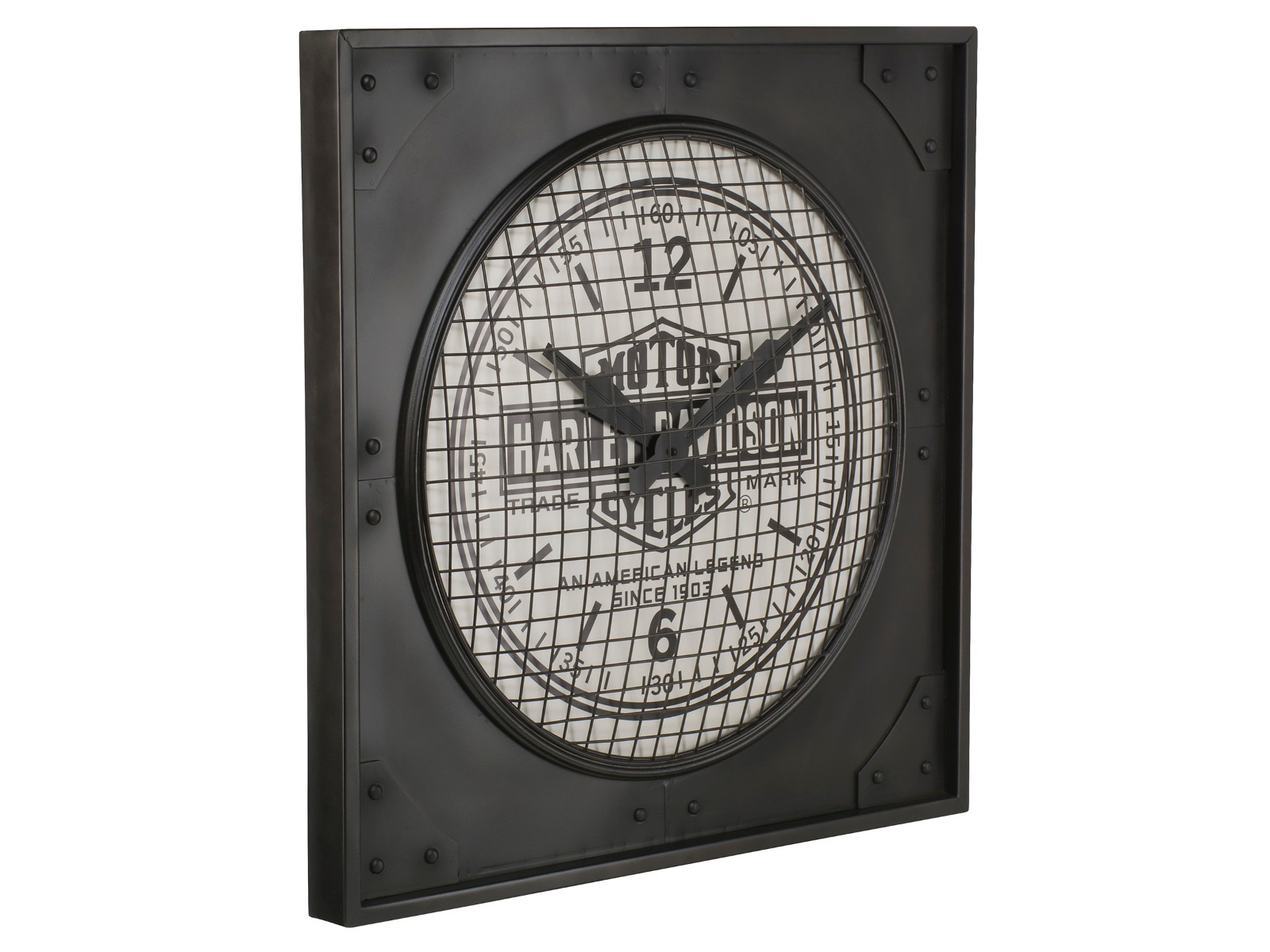 Große, quadratische Metalluhr mit Industriecharakter und gealtertem Finish. Mit nostalgischem Bar & Shield-Logo und "AN AMERICAN LEGEND SINCE 1903"-Grafik auf dem Ziffernblatt, geschützt durch einen robusten Metallkäfig. Abmessungen: 24" B x 24" H / 61 x 61 cm Ziffernblatt: 19" Durchmesser / 48 cm