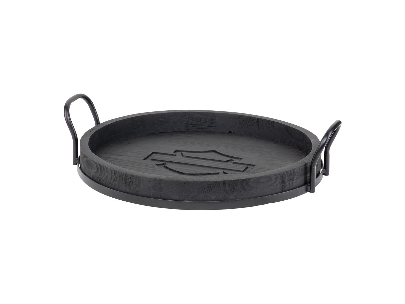Das hübsche Serviertablett aus Holz mit Metallgriffen ist in der Mitte mit dem lasergeschnittenen Open Bar & Shield-Logo versehen. Abmessungen: 17" Durchmesser / 43 cm