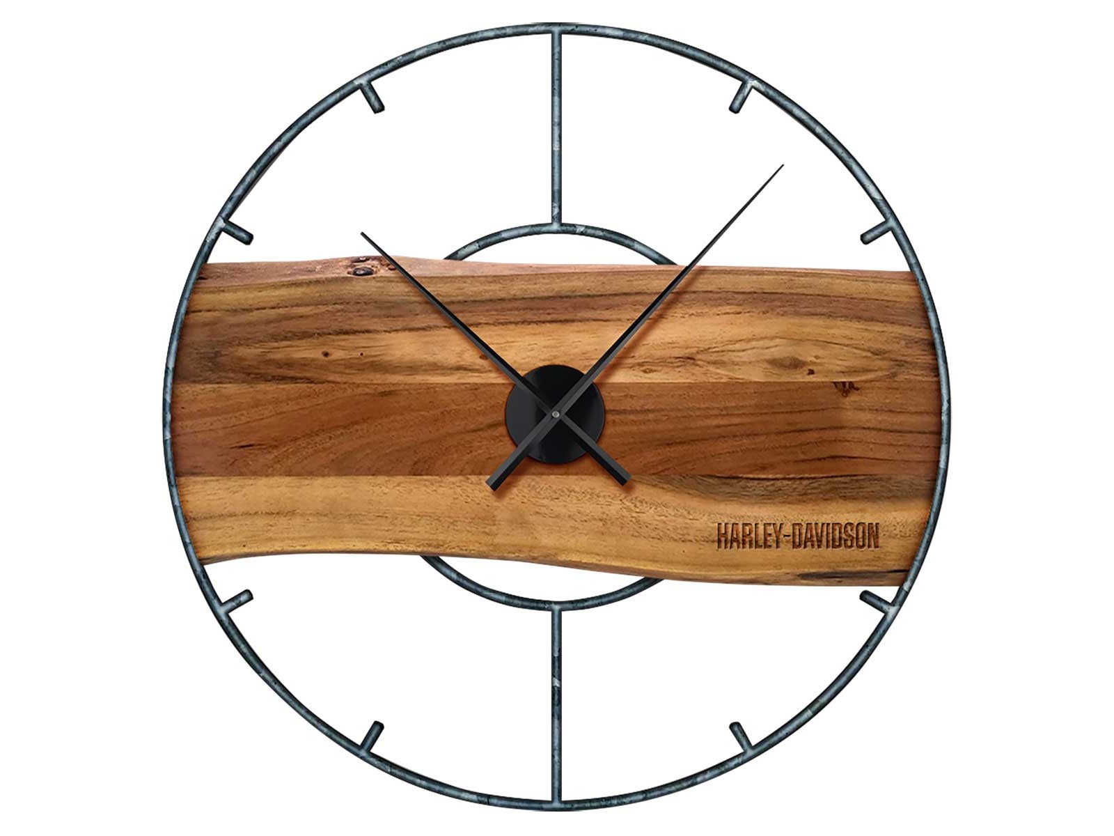 Wanduhr mit verzinktem Metallrahmen und einem massiven Holzkern mit lasergraviertem Harley-Davidson Logo. Kontinuierlich schwingendes Uhrwerk. Benötigt eine AA-Batterie – nicht enthalten. Abmessungen: 16" Durchmesser / 41 cm