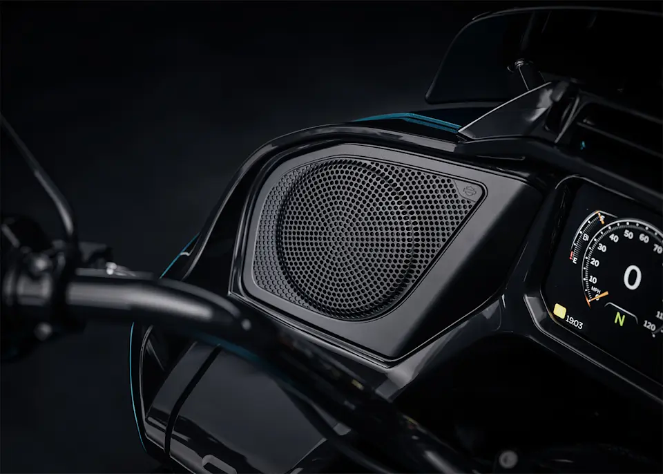 Ein Vierkanal-Verstärker mit 200 Watt Nennleistung sorgt dafür, dass die in die Verkleidung integrierten Lautsprecher die Wind- und Motorgeräusche übertönen. Alle Einstellungen lassen sich auf dem 312 mm großen Skyline OS TFT-Display vornehmen.